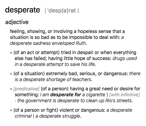 If you really are desperate, in great need or desire it…would acknowledging this fact really be so bad. Play it cool, sure. But if you’re of a certain age, maturity, and intelligence, we’re going to know no matter how suave you appear to be. And I don’t think it’s all that bad.