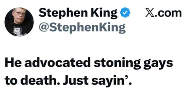 Let’s take the example of Stephen King. After Charlie Kirk’s Assassination, he came out and accused Charlie Kirk of saying Gay people should be stoned.