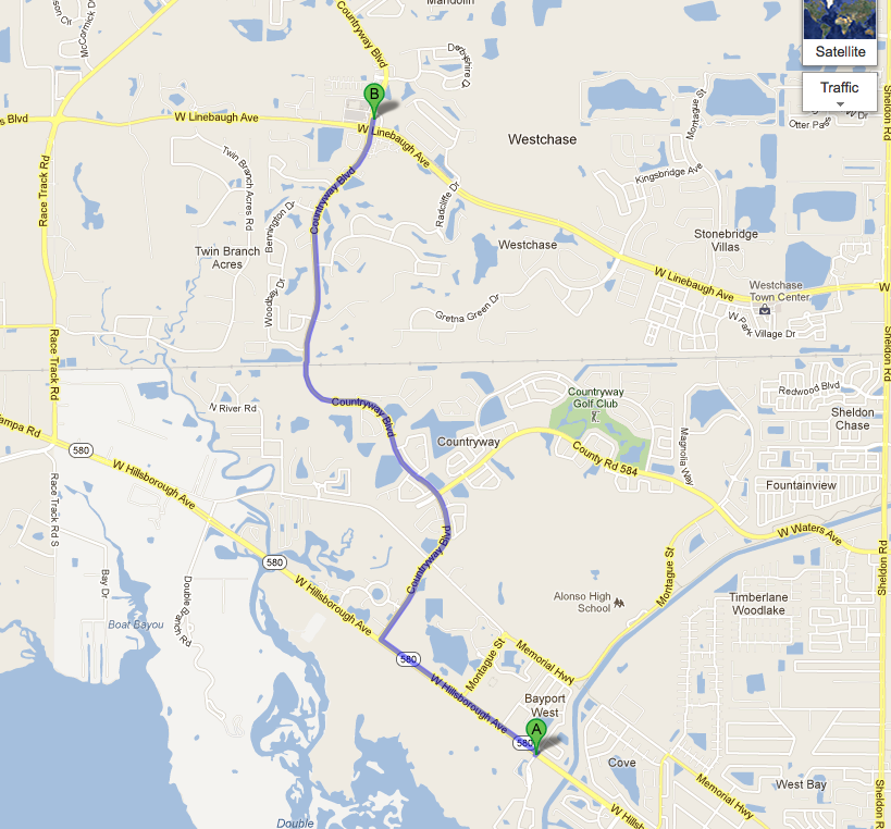 Cruising past the first light, our first right hand turn would bring us to Countryway Blvd. Turning right on Countryway Blvd, we’d have to traverse through the winding road for three miles before we get to the intersection of Countryway Blvd and Linebaugh. The gas station where Joey’s friend would be waiting to observe the winner was at the corner of Linebaugh and Countryway Blvd. So basically the winner of our race would be the first person to get through the light, and make that left hand turn to pull into the gas station on the diagonal side of the road. That light could make or break us. If we end up getting to that light and it’s red, whoever’s in the left turning lane would win. Unless someone does something crazy.