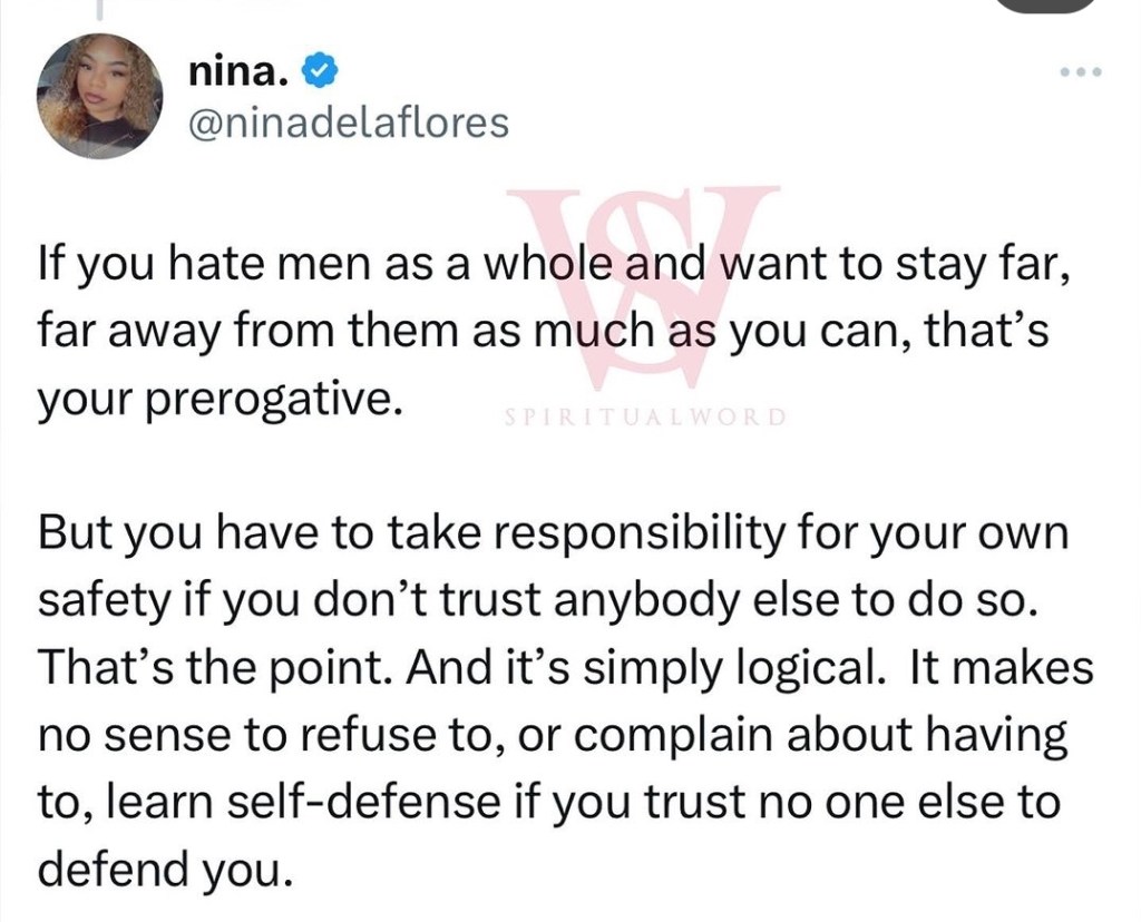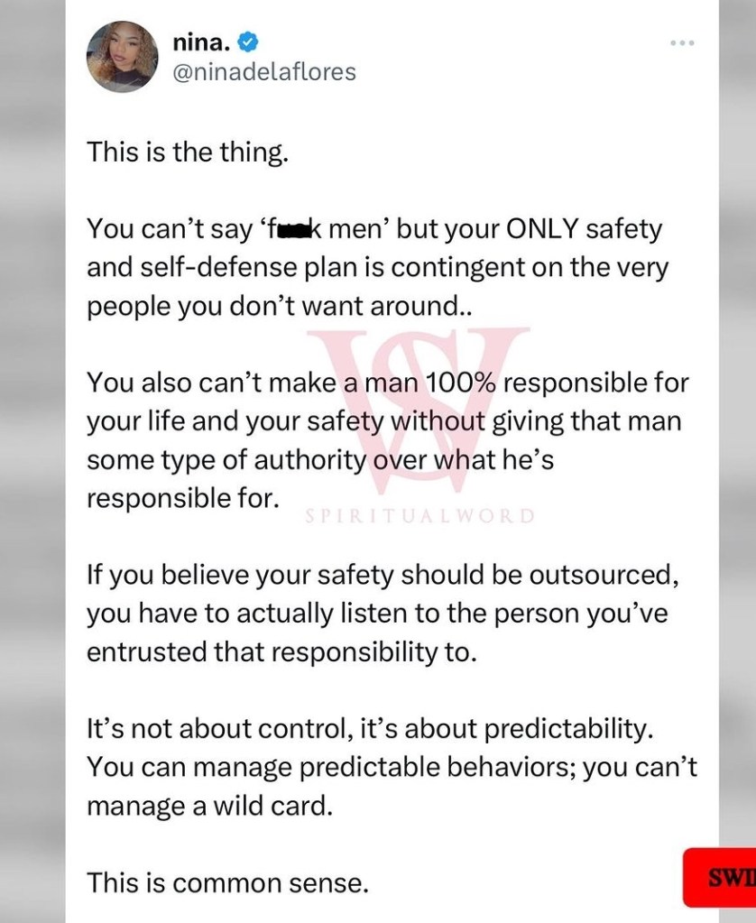 It’s not just me saying this. Recently, other women have begun speaking out on this issue. It will never make sense to place so much responsibility on men, while stripping away their control and silencing them from telling you what you can and can’t do regarding your safety.